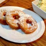 - Die Apfelscheiben durch den Teig ziehen, in das heiße Öl geben und goldbraun backen.